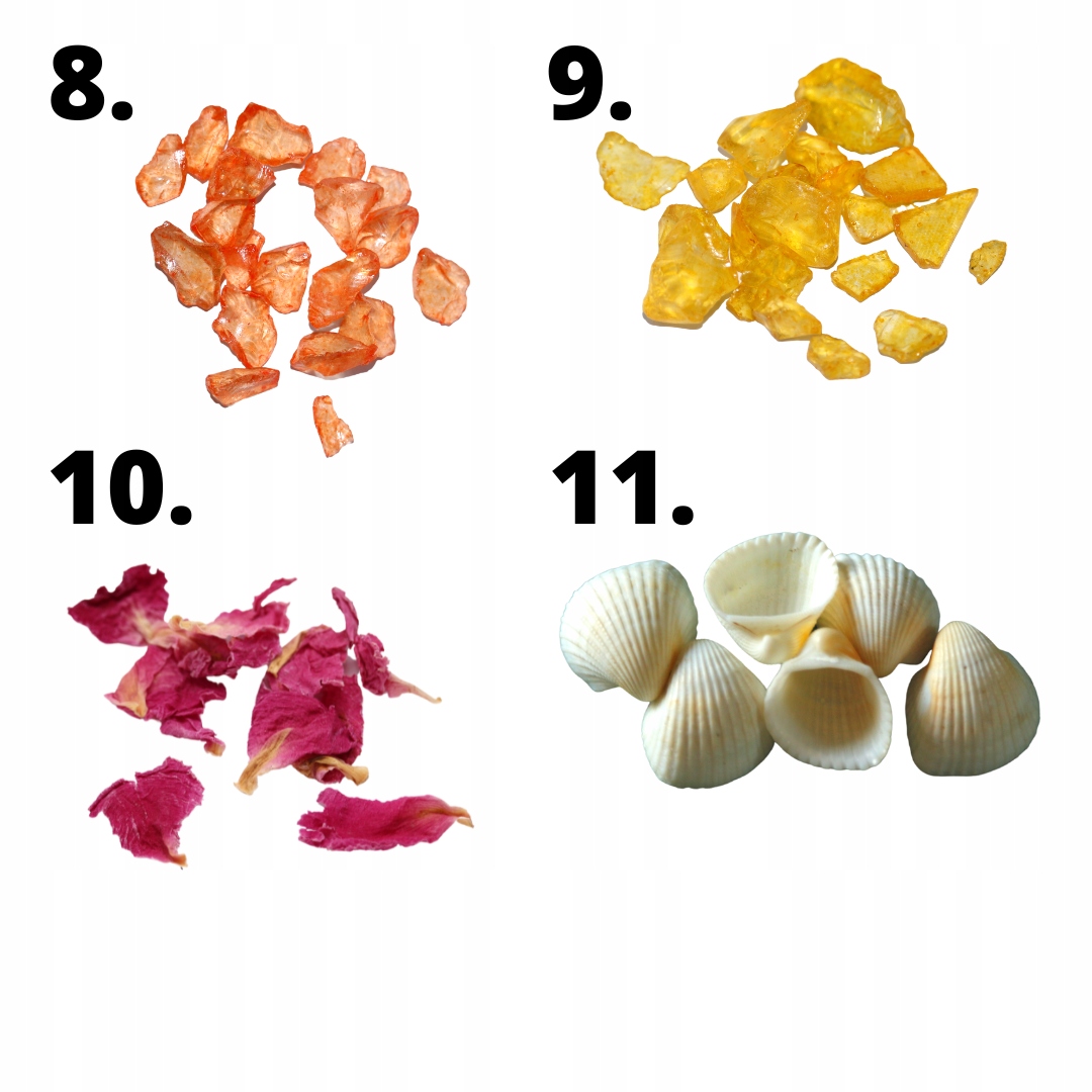 – Accesorii pentru decorarea lumanarilor, boabe de cafea, flori uscate de lavanda, petale uscate de trandafir, pietricele decorative galbene, scoici, petale uscate de bujor, garoafe, muguri de trandafir uscat